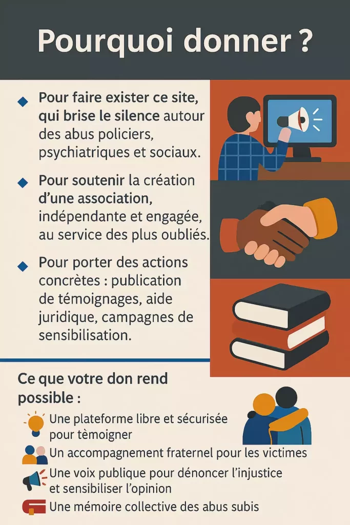 🔹 Pour faire exister ce site, qui brise le silence autour des abus policiers, psychiatriques et sociaux.